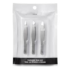 Kit includes a flat top tweezer for removing thicker hair, angled tip tweezer for shaping brows, and pointed tip tweezers for fine and ingrown hair
