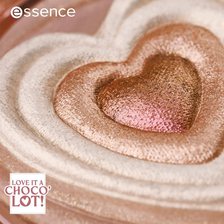 Illuminate the world with the essence LOVE IT A CHOCO' LOT! highlighter glaze 01 Heartbeats & Choco Treats! The cream to powder highlighter is surrounded by a highly reflective, gloss-like gel texture that enhances your natural glow. Shaped like a heart, it comes with three versatile shades that can either be blended together for a unique, multidimensional glow or applied individually to accentuate your best features. Elevate your make-up routine with this must-have product!