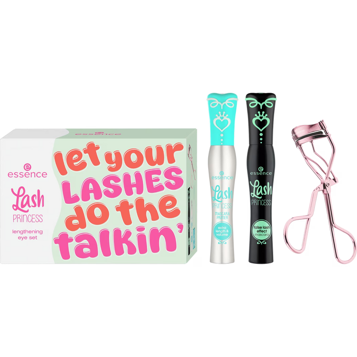 The essence Lash PRINCESS lengthening eye set 01 Crown Worthy Lashes is your royal ticket to effortlessly captivating eye looks. Featuring three bestselling eye products, this curated trio delivers length, volume and lift like never before. Start with the handy essence Lash curler 01 to create the perfect curl, then apply the essence Lash PRINCESS MASCARA PRIMER extra length & volume to lift every lash from root to tip. Follow with the legendary essence Lash PRINCESS false lash effect mascara for striking definition and show-stopping volume. Whether you're going for natural charm or full-on drama, this set has every lash covered.