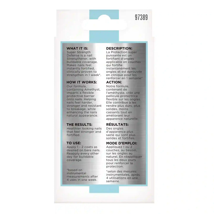 Sally Hansen's new Repair + Rescue Super Strength Defense will instantly fortify and is clinically and consumer tested to strengthen fragile nails in just 1 week*. This strengthener, containing Amethyst, imparts a flexible, protective barrier onto the nails, helping nails feel harder, stronger, and resistant to breakage while enhancing the nail's natural appearance.